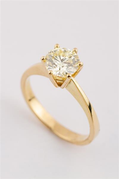 18 krt. gouden solitair ring met een briljant van 1.33 ct. Zuiverheid: VVS2, Kleur: light yellow (met IGI certificaat Antwerpen).