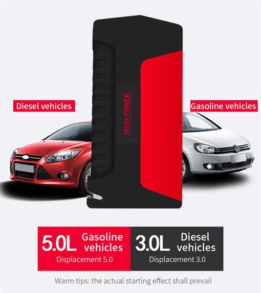 De ideale startbooster, naast het starten van uw auto(benzine & diesel) kunt u ook uw telefoon, tablet of laptop opladen. Voor een eventuele noodsituatie beschikt de start booster ook over een gordelsnijder, noodhamer en een sterke zaklamp. Na het starten van uw auto met de jump starter dient deze binnen 30 seconden verwijderd te worden om veiligheids risico's te voorkomen. Kleur: rood/zwart. Algemene informatie: - Input: 15V, 2A - Met zaklamp - 2x USB - Output: 5V/2A, 12V/2A, 16V/3.5A, 19V/3.5A - USB output: 5V-2A - Start current: 200A - Peak current: 400A(3S) - Laad tijd: 4 uur - LED-laadtoestand-indicator - LED-lamp met 3 standen (continu/S.O.S./stroboscooplicht) - Diesel tot 3 liter, benzine tot 5 liter. - Powerbank afmeting: 8x4x16.5cm U ontvangt: - Jumpstarter - Startkabels - Autolader - Lader - Verwisselbare plug DC - 8x voedingskabel voor laptop